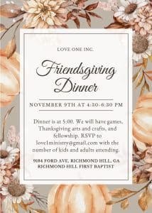 Please RSVP to love1ministry@gmail.com with the number of adults and children attending by November 3rd so we can prepare.